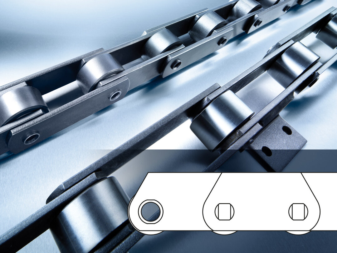 Roller deep link chains represent a special design of a normal bush conveyor chain. Here, the tabs are perforated off-center, so that the transported goods can be transported directly on the chain without further attachments.ELITE-Highlights